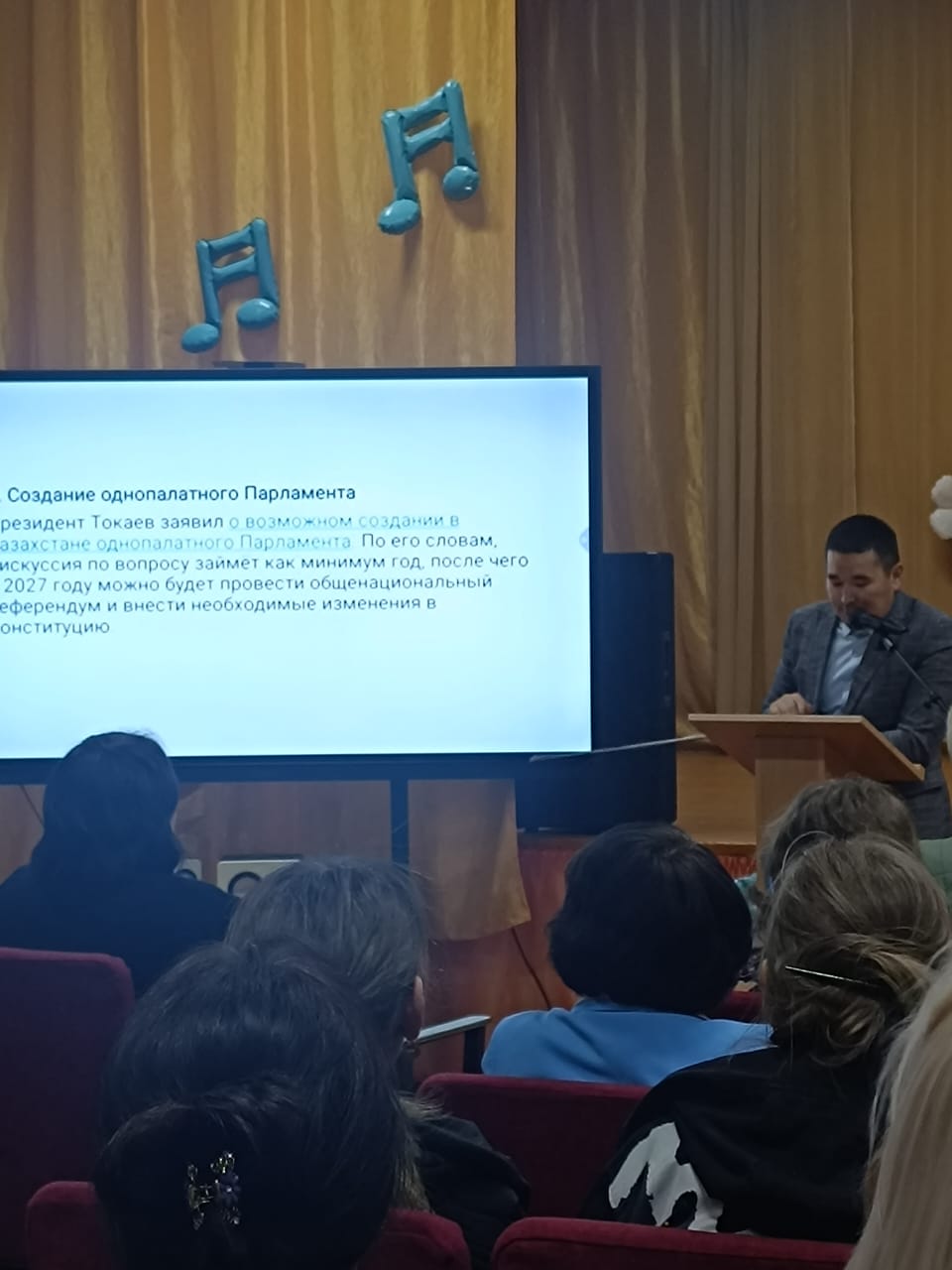 1. Мемлекет Басшысы Қасым-Жомарт Тоқаевтың 2025 жылғы 8 Сентябрьтегі "Қазақстан жасанды интеллект дәуірінде: цифрлық трансформация арқылы өзекті міндеттер және оларды шешу" атты Жолдауы. Тарих пәнінің мұғалімі Д. А. Шакаримов ата-аналарды Жолдаудың негізгі ережелерімен таныстырды. Атап айтқанда, ол балаларда цифрлық сауаттылықты дамыту, жаңа кәсіптік және білім беру сын-тегеуріндеріне дайын болу қажеттігін, сондай-ақ ХХІ ғасырдың дағдыларын қалыптастырудағы отбасы мен мектептің рөлін атап өтті.